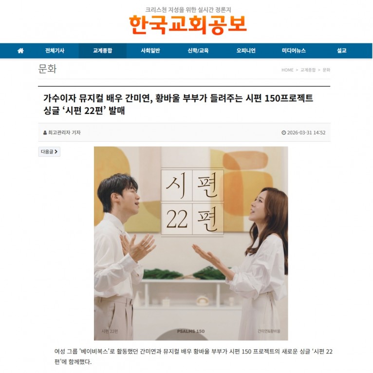 [기사] 가수이자 뮤지컬 배우 간미연, 황바울 부부가 들려주는 시편 150프로젝트 싱글 ‘시편 22편’ 발매(한국교회공보)