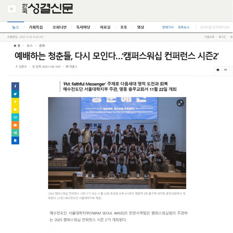 뮤직타임 [기사] 예배하는 청춘들, 다시 모인다…‘캠퍼스워십 컨퍼런스 시즌2’(한국성결신문)